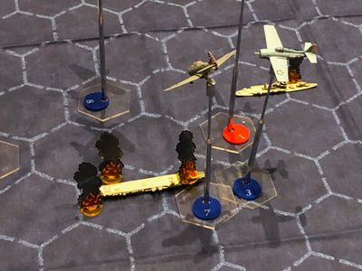 In Aerodrome® games, players “fly” small model aircraft around a “battlefield”, a playing mat with a hexagonal grid to regulate movement. Each model aircraft is mounted on a Flightstand (a telescoping antenna of a specific, standard size on a hexagonal base) to facilitate movement and to simulate altitude changes. Aircraft have some common characteristics, and other, differing characteristics, for flight, maneuvering, weaponry, ability to withstand battle damage, etc., in rough correspondence to their real-world counterparts.
